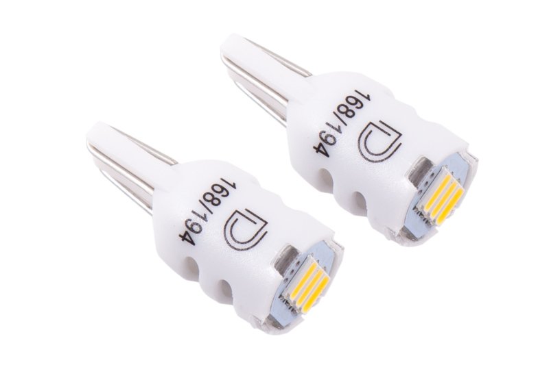 FeaturesDiffused lens design for even spreadProven performance highly reliableIncreased output with LED AppearancePlug and play simple installationOverviewDesign. The 194 HP3 LED bulb is a compact simple LED replacement with proven performance. The single diffused optic spreads light in the original lamp for OEM-style appearance and function. With its dual-lead contacts it will fit snugly in the socket and its light weight means it won’t vibrate loose over time.Reliability. Unlike other bulbs on the market this bulb is built with constant-current circuitry along with transient suppression. That means this bulb will last for years not months with no flickering or failure. And like every Diode Dynamics product it’s backed by an industry-leading three-year replacement warranty.Brightness. With 56 lumens of true measured output the HP3 LED will provide about double the total light compared to your original 5W 194 or 168 sized bulb. Its even spread in the housing makes for a good amount of useful light whether mounted in a straight or side-plug orientation.Colors.In addition to vibrant colors of blue red amber and green the 194 HP3 is available in a number of white color options. These include a cool white 6000K warm white 3000K a 5000K or pure white and a 4000K or natural white. Whether you want a modern cool white appearance or a traditional warm white color with more output we have the color to fit your need!