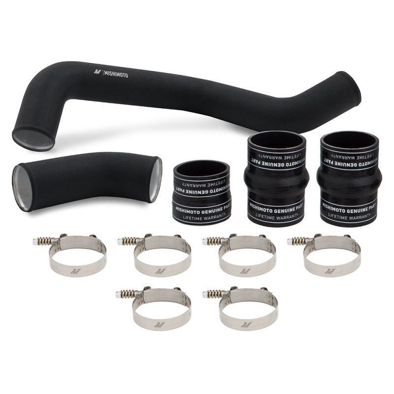 Improve the power and efficiency of your 2017-2019 Chevrolet/GMC 6.6L Duramax L5P with the Mishimoto hot-side intercooler pipe and boot kit. The factory hot-side pipe for the L5P is a measly 2.5in that chokes the engine, while the tight bends and built-in resonator create even more restriction. The Mishimoto hot-side intercooler pipe is 3in in diameter throughout and eliminates the factory resonator to significantly increase airflow, resulting in more power potential. Mishimoto designed this pipe as two pieces, like the factory pipe, for ease of install. This kit also includes our silicone boots with DuraCore™ technology. Mishimoto DuraCore™ technology is the synthetic material that comprises the innermost layer of all Mishimoto silicone diesel boots. Compared to normal silicone, DuraCore™ provides superior resistance to heat, pressure, fuel, and oil. This effectively increases the life of our boots by preventing leaks and blowouts.To add even more reliability, this kit includes Mishimoto constant-tension T-bolt clamps for accurate and consistent holding power. The Mishimoto 2017-2019 Chevrolet/GMC 6.6L Duramax L5P hot-side intercooler pipe and boot kit is a direct bolt-on upgrade and is available in a polished or wrinkle-black powder coated finish. Like all our Duramax products, this hot-side intercooler pipe and boot kit includes our Mishimoto Lifetime Warranty for a lifetime of performance.